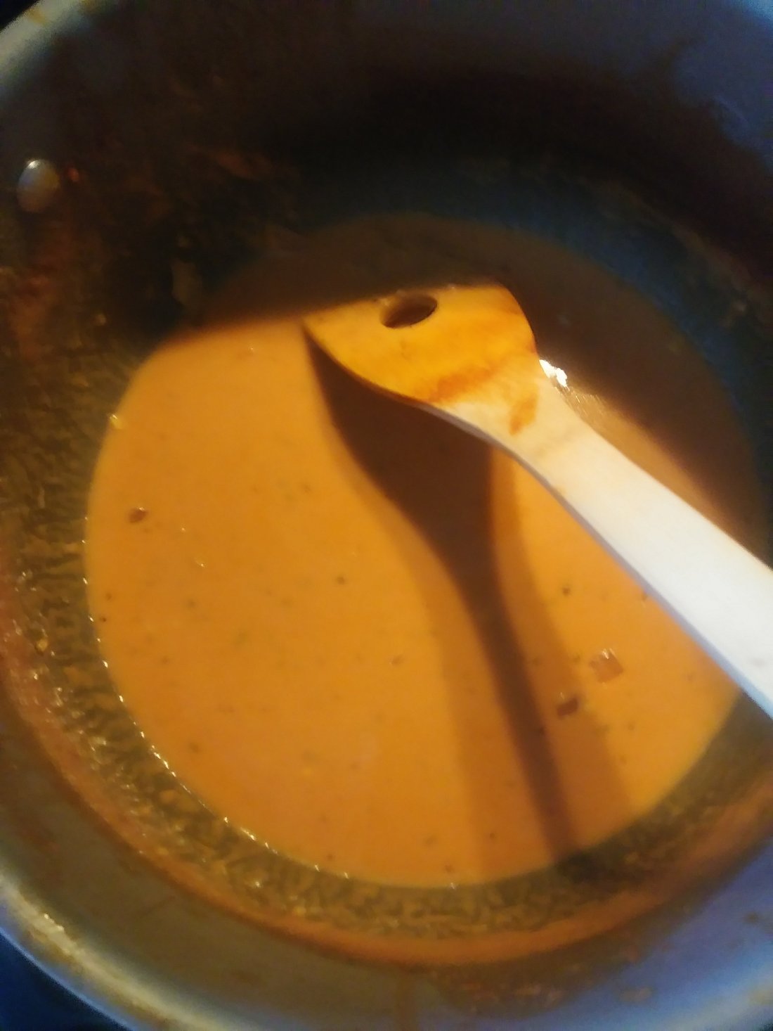 Then add in diced tomatoes and v8. Let it simmer for a hour and add spices. I did basil, salt and pepper. When it cooled I added whipping cream to taste yummy. The next time I made it I didnt use v8 I u see tomato past and water. These to ways tasted like heaven.